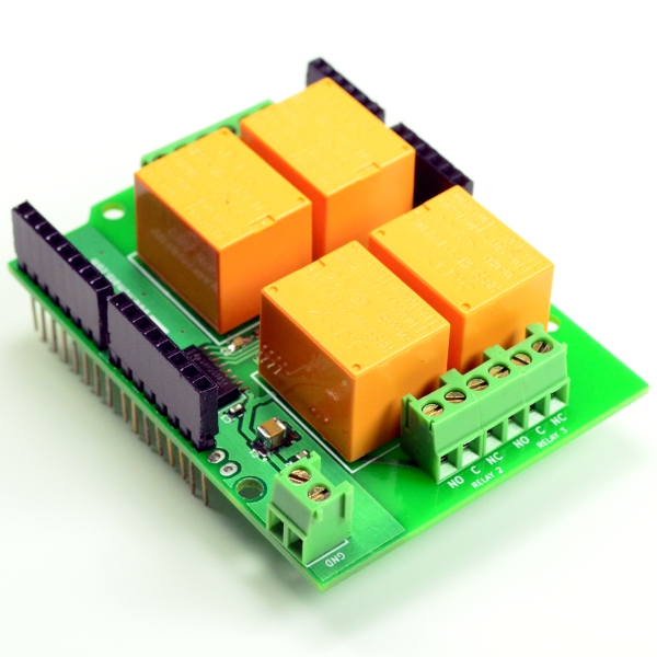 ArduinoのデジタルI/O 4点でリレーの制御を行うことができます。D8、D7、D2、D4に割り付けられており、単なるデジタル信号のON,OFFだけですので、プログラムは簡単です。